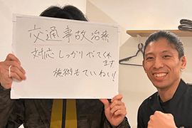 保険会社とのやり取りについても、ひとつひとつ丁寧に説明してくださり、安心して通院することができました。嘘偽りのない誠実な対応に心から感謝しています。
